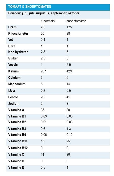 Tomaat bevat... vet, eiwit, koolhydraten vezels, natrium, kalium, calcium, magnesium, ijzer, jodium, fosfor, vitaminen A, C, E, K en B-complex (behalve B12).